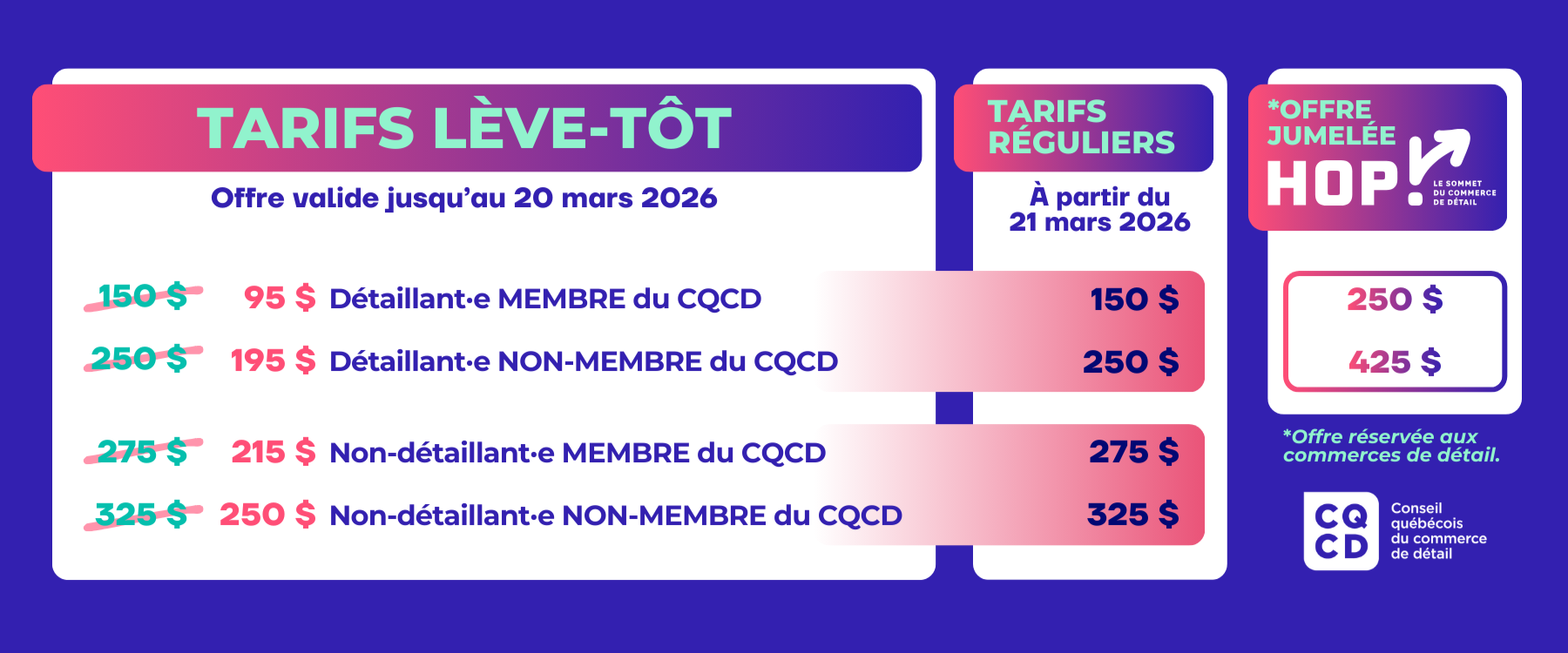 Enjoy an exclusive discount by combining your registrations! A preferred rate to double your networking opportunities within Quebec’s retail community.