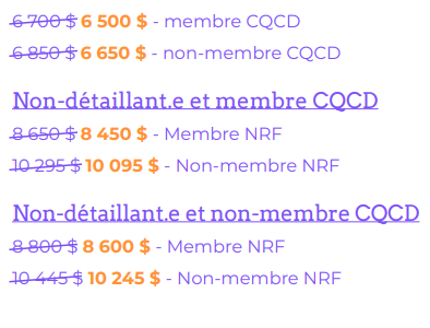 C’est avec enthousiasme que nous annonçons le grand retour des missions commerciales organisées par le Conseil québécois du commerce de détail (CQCD) aux États-Unis, notamment au plus grand événement mondial en lien avec le commerce de détail, le NRF Retail’s Big Show. Cette initiative marque une nouvelle opportunité pour les détaillants québécois d’observer les dernières tendances, de participer à des visites de magasins et des séances de réseautages exclusives. Nous vous invitons à vous joindre à nous pour cette expérience unique qui promet d’être enrichissante pour votre entreprise lors de l’édition 2025 du Retail’s Big Show!
