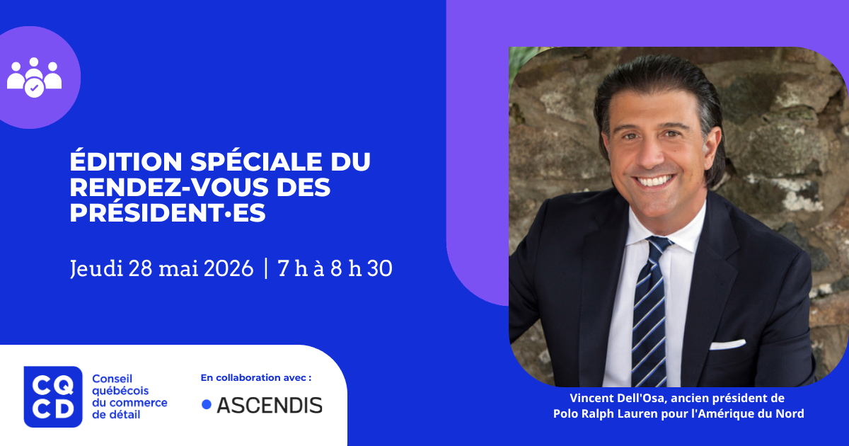 Le 28 mai 2026, le Conseil québécois du commerce de détail tiendra son Rendez-vous des président·es, un petit-déjeuner privé et exclusif réunissant des dirigeant·es influent·es du commerce de détail.