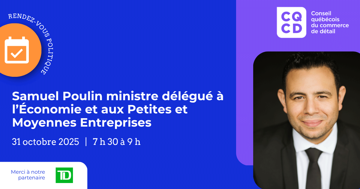 Le président-directeur général du Conseil québécois du commerce de détail (CQCD), monsieur Damien Silès, en collaboration avec la Banque TD, est ravi de vous convier à une rencontre exclusive avec Monsieur Samuel Poulin, ministre délégué à l’Économie et aux Petites et Moyennes Entreprises.